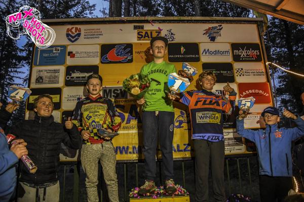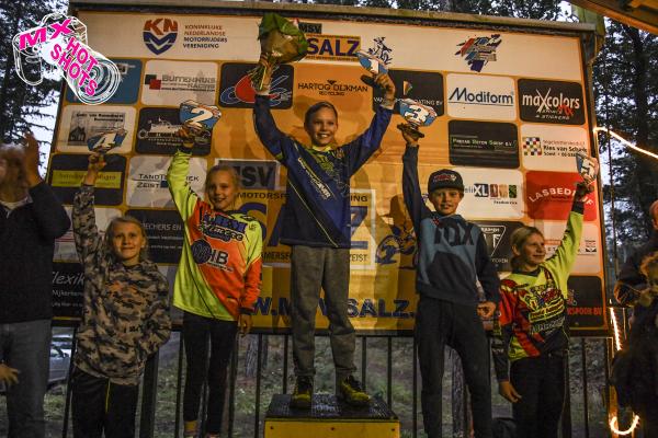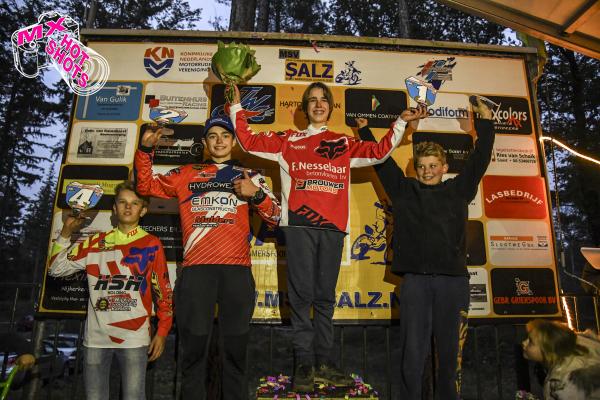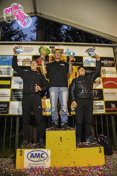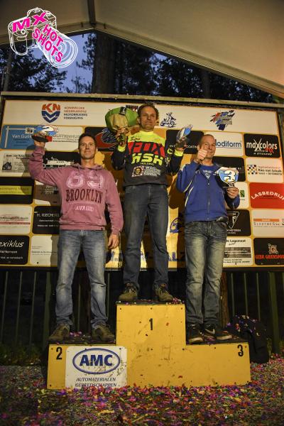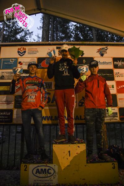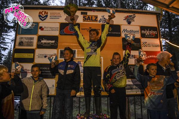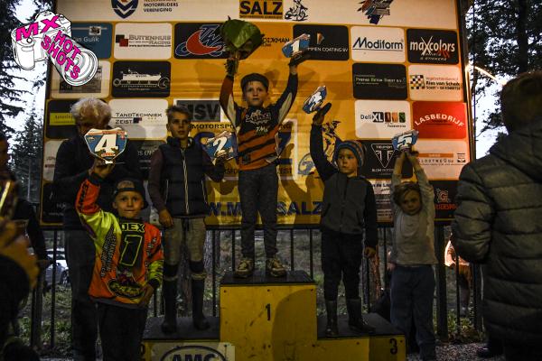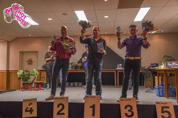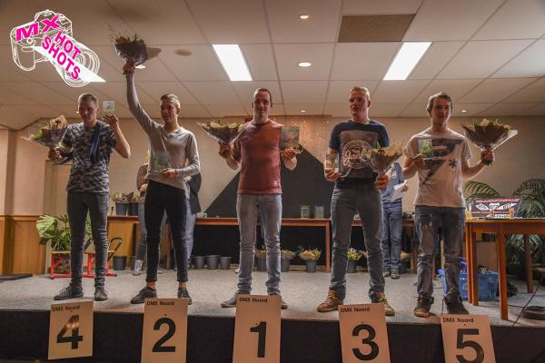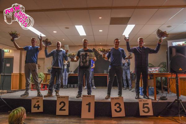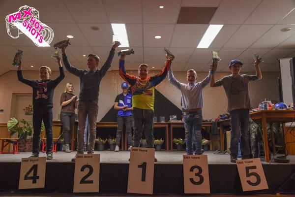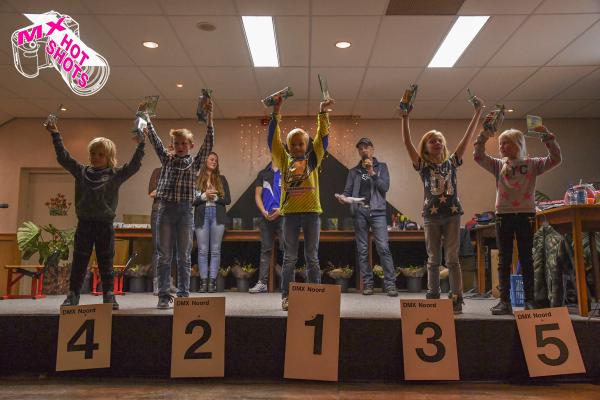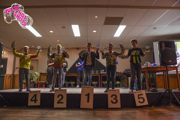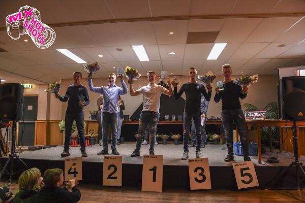 22 oktober was de landelijke DMX finale in Amersfoort. De MSV Salz had alles prima voor elkaar zodat mooi op tijd de trainingen konden beginnen. De baan was zwaar, zeer zwaar. Hiervan waren vooral de 50cc-tjes de dupe. Veel van deze toppers in de dop vielen dan helaas ook uit. Wat ook een smetje op de dag wierp was dat de tweede manches ingekort moesten worden omdat er tijd verloren ging door twee rode vlaggen; Het starthek viel al toen de narijder nog niet terug was en de tijdwaarneming nog niet klaar.De Noordelijke coureurs deden het prima. Helaas vielen er bij valpartijen bij de start diverse slachtoffers en ook waren de diepe knippen scherprechter met valpartijen tot gevolg. Gelukkig viel het aantal blessures alleszins mee. Maar vooral door de valpartijen bij de start waren een paar potentiële Noordelijke kampioenskandidaten nagenoeg kansloos voor de eindoverwinning. Toch hebben we diverse prijzen en ook een paar kampioensbekers mee naar het noorden kunnen nemen. Bij de 50cc kwam het hele podium, dus de eerste vijf coureurs uit district Zuid. Ook bij de 65cc kleine wielen geen Noordelijke coureurs op het podium. Maar bij de 65cc grote wielen wist David Holtkamp het kampioenschap binnen te slepen met een derde plaats in de eerste manche en een manche overwinning in de tweede. Levy Nijs en Ward Monkel werden in deze klasse respectievelijk derde en vijfde, dus in totaal drie prijzen voor Noord. Ook bij de 85cc kleine wielen stonden drie deelnemers aan de Noordelijke competitie op het podium, Stan Drees, Dirk Winder en Xander Vossebeld werden respectievelijk tweede, derde en vijfde. In de eerste manche van de 85cc grote wielen wist Troy van der Vinne de overwinning binnen te vechten. Ook in de tweede manche ging Troy goed maar door een valpartij werd hij vijfde. Met een tweede plaats in de eindrangschikking was Troy de enige Noordeling op het podium. In de MX2 Tweetakt was Ezra Veldman een goede kandidaat voor het kampioenschap. Helaas kwam hij de eerste manche bij de start ten val en waren zijn kansen nagenoeg verkeken. Ezra wist wel op te rukken naar een vierde plek maar zelfs door de tweede manche te winnen bleef hij in de eindstand steken op de derde plaats. Voor insiders misschien geen verrassing, maar veel anderen wel, Rowdy Kroon nam de eerste manche brutaal de kopstart en reed de rest van de manche netjes op de tweede plek. Ook de tweede manche reed Rowdy de hele wedstrijd op de tweede plaats. Het resultaat was een prachtige tweede plek in de eindstand. Bij de MX2 Viertakt was Tim van Houten een goede podiumkandidaat. Tim maakte dit ook waar, hij werd twee keer tweede en daarmee ook tweede in de eindstand. Even leek het erop dat Tim kampioen zou worden want door een valpartij van z'n belangrijkste opponent reed Tim lange tijd op kop in de tweede manche. Helaas kwam ook hij een kwart rondje voor de finish ten val. Ondanks dat het vrij lang duurde voor Tim weer op de motor zat wist hij toch als tweede te finishen. Bij de koningsklasse, de MX1-3, deed Bart Conen waarvoor hij gekomen was. Met twee manche overwinningen was hij overtuigend landelijk DMX kampioen. In de Veteranen klasse streden Wouter Bron en Frido Reitzema om de derde plek op het podium. De eerste manche werd Frido derde en Wouter vierde. Omdat het de tweede manche net andersom was mocht Wouter de derde prijs mee naar huis nemen. Ook de niet genoemde Noordelijke coureurs hebben een prima wedstrijd gereden. Met z'n allen hebben we laten zien dat we ook in het Noorden kunnen crossen. Door de duisternis bij de huldiging zijn de foto's van slechte kwaliteit. Gelukkig zijn de meeste coureurs nog wel te herkennen. ![]() ![]() ![]() ![]() ![]() ![]() ![]() ![]() ![]() |