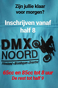 Net als voorgaande jaren en exact zoals in het DMX Noord reglement staat vermeld begint de inschrijving bij de DMX in Emmen op 24 maart 2019 om 7:30. Voor de 65cc en 85cc eindigt de inschrijving om 8 uur, voor de overige klassen om 8:30 uur. |