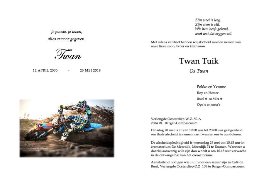Met grote verslagenheid hebben we vernomen, dat onze DMX Noord deelnemer Twan Tuik door een tragisch ongeluk om het leven is gekomen. Tijdens een trainingsongeval is Twan zwaar gewond geraakt en later in het ziekenhuis overleden.We leven mee met de nabestaanden en wensen de naasten van Twan sterkte in deze extreem moeilijke tijd. Uit respect voor Twan en zijn familie is besloten dat de wedstrijd die voor zondag 26 mei stond gepland op het circuit van Veendam niet doorgaat. |